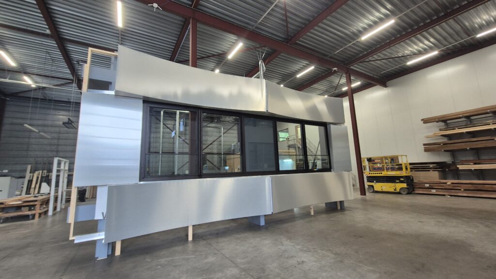 De aluminium composiet bekleding bracht extra uitdagingen met zich mee op het gebied van maatvoering, waterdichtheid en montagevolgorde. De gebogen gevelcassettes zijn bijzonder: gewalst en samengesteld, aangestuurd vanuit een 3D-computermodel dat rechtstreeks de fabriekmachines bedient.