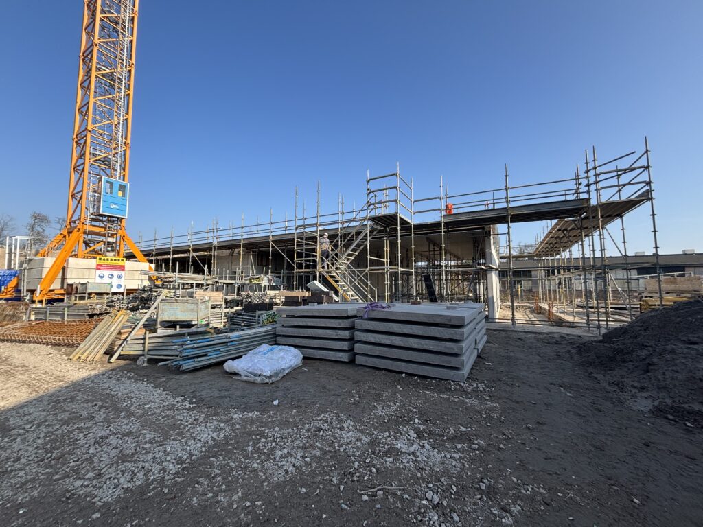 Vervolgens is gestart met de werkzaamheden voor de eerste verdieping. Het grootste deel van de breedplaatvloeren ligt inmiddels op zijn plek, waarmee de volgende bouwfase snel kan worden ingezet.